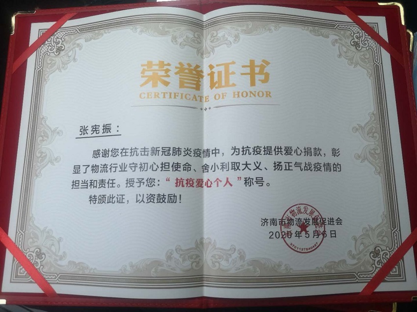 經評選,振宇物流榮獲“抗疫先進單位”,總經理張憲振榮獲“抗疫愛心個人”!