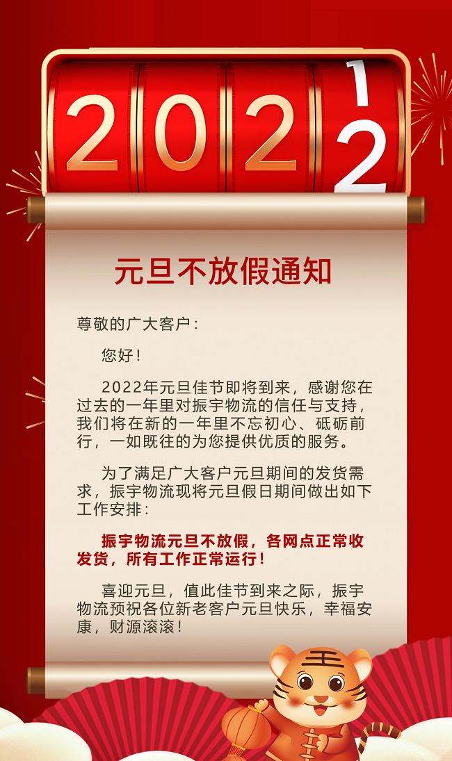 為了滿足廣大客戶元旦期間的發貨需求,振宇物流現將元旦假日期間做出如下工作安排: