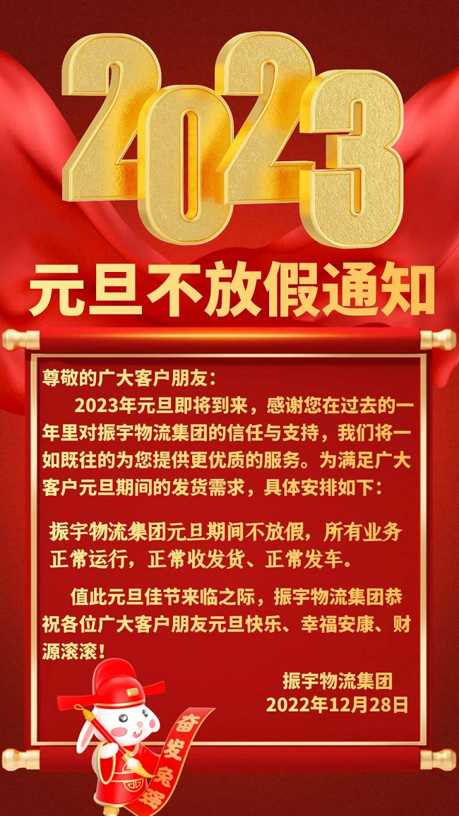 2023年元旦即將到來,感謝您在過去的一年里對振宇物流集團的信任與支持,我們將一如既往的為您提供更優質的服務。為滿足廣大客戶元旦期間的發貨需求,具體安排如下: