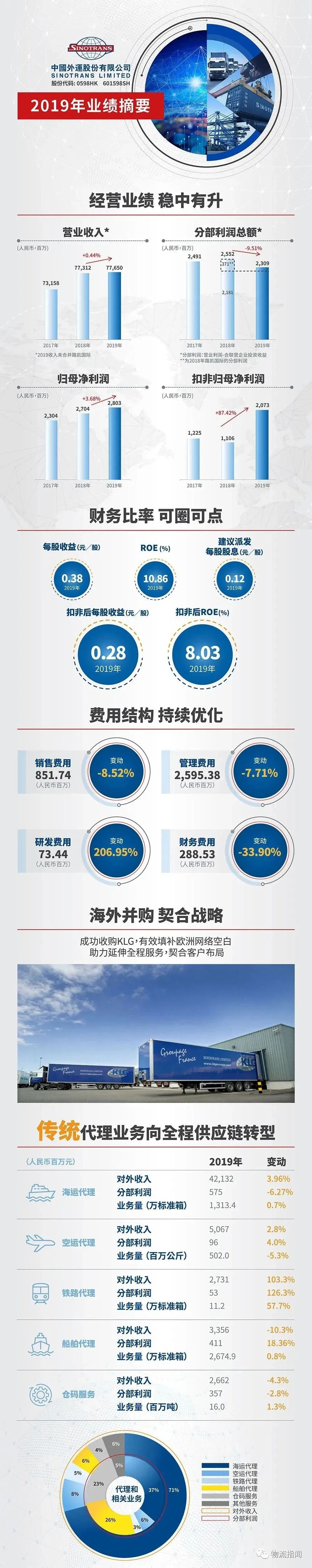 據悉,2019年,中國外運實現營業收入776.50億元,同比增長0.44%(可比口徑下實現增長2.4%);分部利潤實現23.09億,可比口徑下實現增長5.9%。實現歸母凈利潤28.03億元,同比增長3.68% ;實現扣非后的歸母凈利潤20.73億元,同比增長87.42%。每股收益為0.38元人民幣??鄯呛蟮腞OE增長了3.08個百分點。