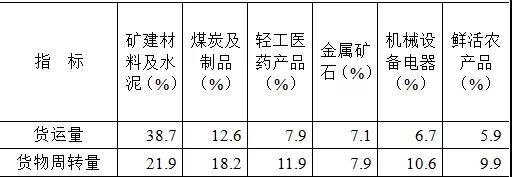 貨運量的主要貨類構成中,“礦建材料及水泥”占比最高,為38.7%;其次是“煤炭及制品”,占比12.6%;“輕工醫(yī)藥產(chǎn)品”“金屬礦石”“機械設備電器”“鮮活農產(chǎn)品”等貨類次之,占比分別為7.9%、7.1%、6.7%和5.9%。