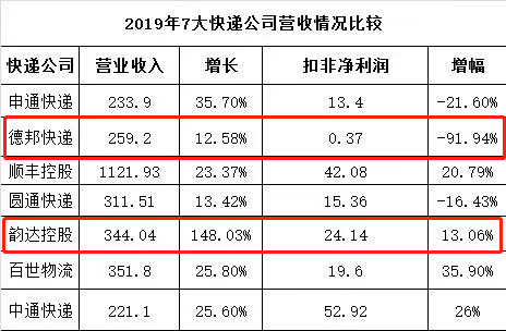 而根據德邦股份發布了2019年業績報告,2019年實現營業收入259.22億元,同比增長12.58%;實現歸屬上市公司股東凈利潤3.24億元,同比下滑53.82%??鄯莾衾麧櫹陆?91.94%。在虧損的邊緣徘徊。