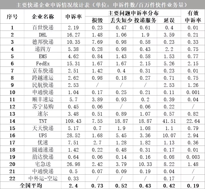 全國快遞企業申訴率(百萬件快件業務量)平均為2.40,有效申訴率平均為0.19。用戶對快遞企業申訴主要問題中,快件損毀申訴率平均為0.73,快件丟失短少申訴率平均為0.52,投遞服務申訴率平均為0.43,快件延誤申訴率平均為0.42。