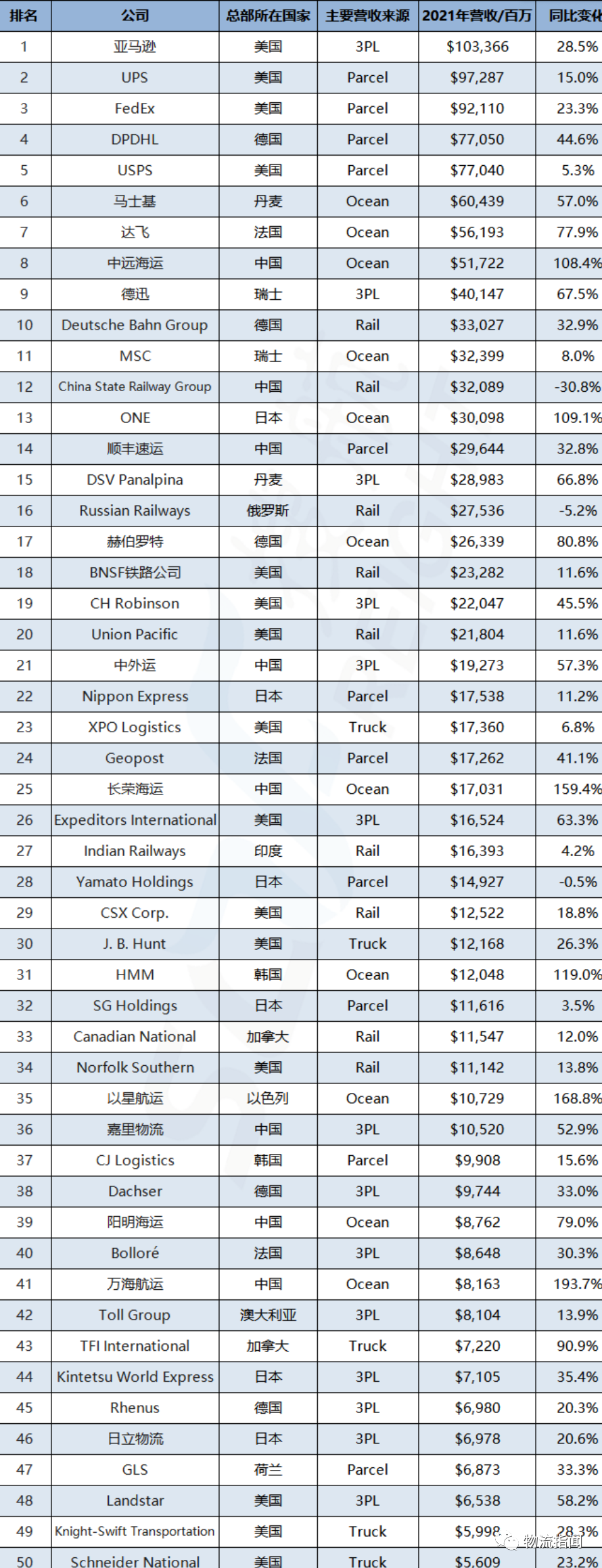 據了解,全球50大運輸供應商2021年的總收入達到了1.29萬億美元,同比增長31.4%,創歷史新高。50家企業中有47家實現了年度增長。