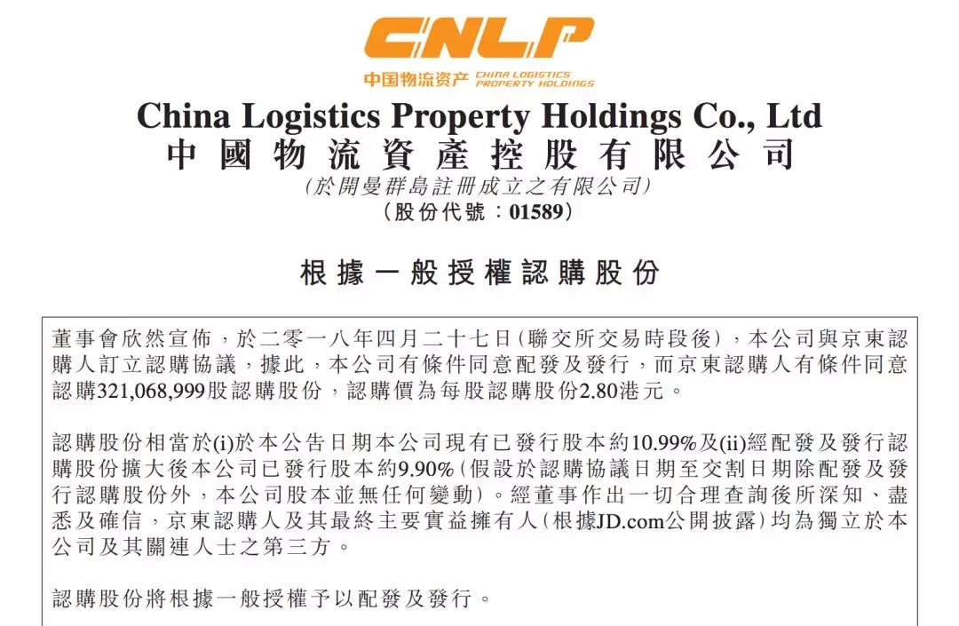 中國物流資產控股有限公司近日宣布,已與京東認購人訂立股份認購協議,京東認購人為JD.com, Inc.子公司。