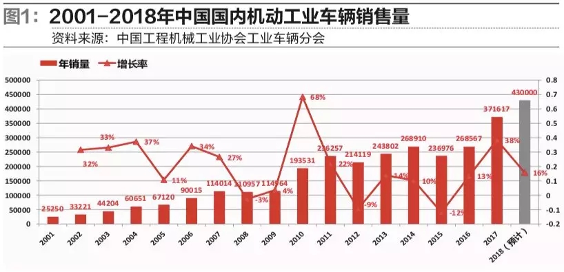 中國已成為工業車輛全球第一的產銷大國。2017 年,中國叉車銷量約 49 萬臺,同比增長 34.23%。其中,國內市場銷量 37 萬臺,同比增長約 38%;出口 12 萬臺,同比增長約 23%。2018年1-8月,中國叉車銷售量已突破40萬臺,達409283臺,同比增長26.7%,其中出口110682臺,比去年同期增幅達37.5%。預計,2018年中國叉車銷量約為58萬臺,其中,國內銷量約為43萬臺,無論是總銷售量、還是國內市場和出口數量均超出預期。