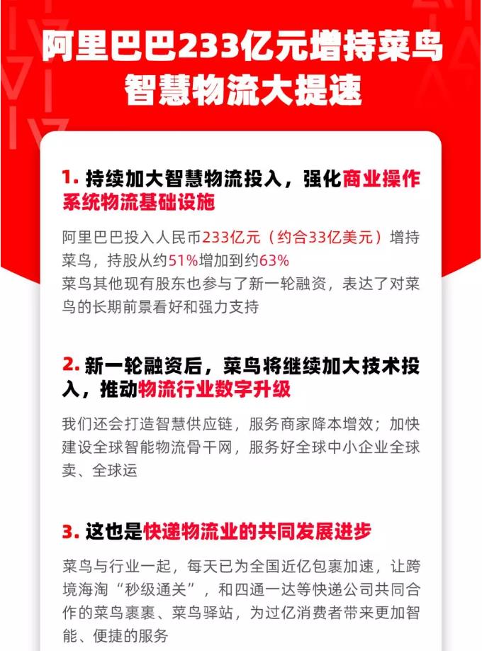 阿里巴巴集團(tuán)11月8日宣布,為持續(xù)加大智慧物流投入,強(qiáng)化商業(yè)操作系統(tǒng)物流基礎(chǔ)設(shè)施,已領(lǐng)銜完成對(duì)菜鳥網(wǎng)絡(luò)新一輪增資。阿里巴巴通過(guò)增資和購(gòu)買老股的方式,投入人民幣233億元(約合33億美元),持有菜鳥股權(quán)從約51%增加到約63%。菜鳥其他現(xiàn)有股東也參與了新一輪融資,表達(dá)了對(duì)菜鳥的長(zhǎng)期前景看好和強(qiáng)力支持。